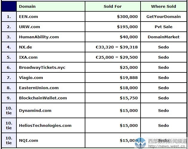 域名EEN.COM注册于1998年,距今已有20年历史,是“异常教育需要”(exceptional educational needs)的缩写,也对应有欧洲企业网络(enterprise europe network)的首字母缩写。据了解,域名EEN.COM的所有者为ANYTHING.COM,经由中介完成交易。目前尚不知买家具体身份,但能以近200万元的价格拿下该域名,实力不凡。 随后是以195,000美元成交的域名URW.COM,这枚域名被澳大利亚购物中心巨头Westfield LLC(西田集团)收购,卖家是Telepathy公司,这笔交易的具体金额也在本期DN榜得以公开,高达19.5万美金,折合人民币超124万元。 排在第三的是英文组合域名humanability.com,成交价为40,000美元,约合人民币25.5万元。该域名直译为“人的能力”,可用来搭建人工智能以及公益类网站等。 紧随其后的是两声母域名NX.de,这枚德国国别域名在sedo榜上以39,318美元成交。字母NX对应有雷克萨斯,以及任天堂推出的一款游戏平台。除此以外,NX.de域名可挖掘的含义十分丰富,可应用的空间较广。 除此以外,榜单上也还有不少的好米,如:三字母ixa.com以29,500美元成交;英文域名broadwaytickets.nyc拍出25,000美元,viagio.com、nqi.com、Global.global、Gold24.com、timedia.com等域名均拍出不错价格。 来源西部数码新闻资讯:DN榜:多个三字母域名成交!ENN.COM以191万元夺魁
