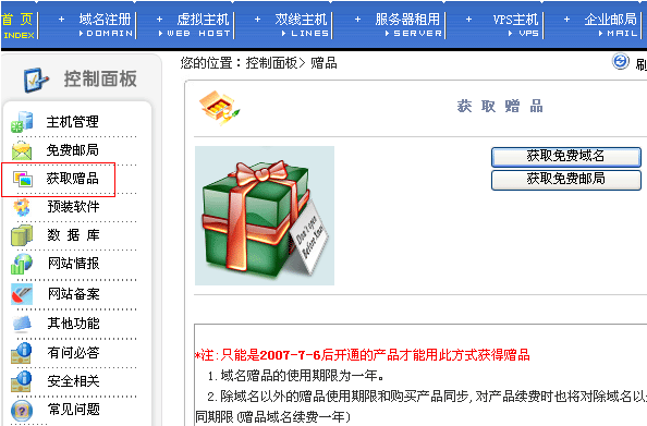 进入虚拟主机管理中心,点击“获取赠品”即可在线开通赠送的域名和企业邮局。